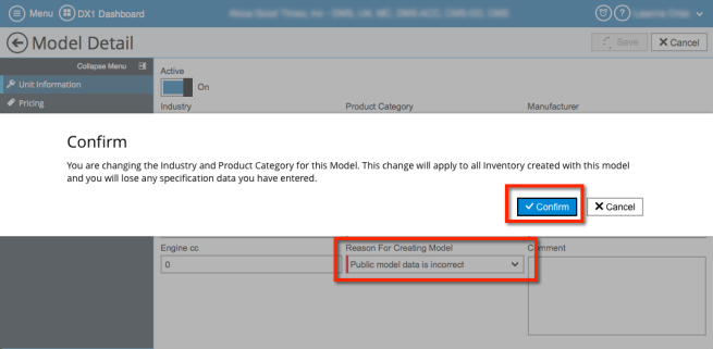 NOTE: You will have to confirm the change since this will affect all models received into inventory and change any previously entered specifications.
