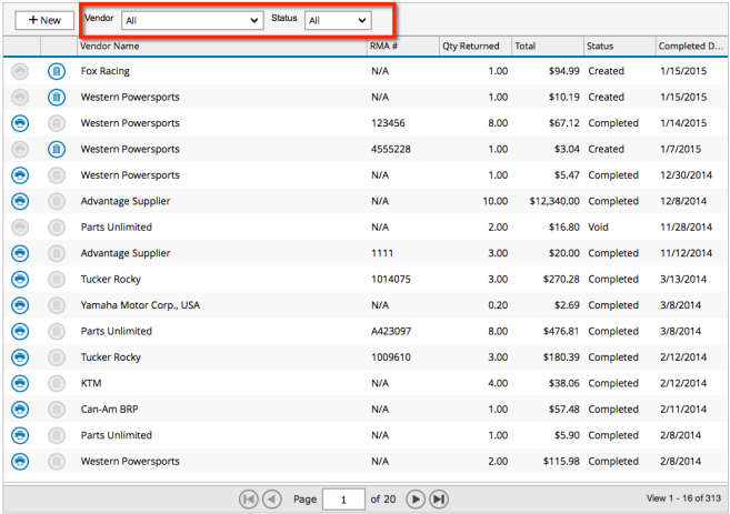 All returns are displayed in chronological order. Filter returns via the Vendor drop down menu and/or selecting Created from the Status drop down menu.