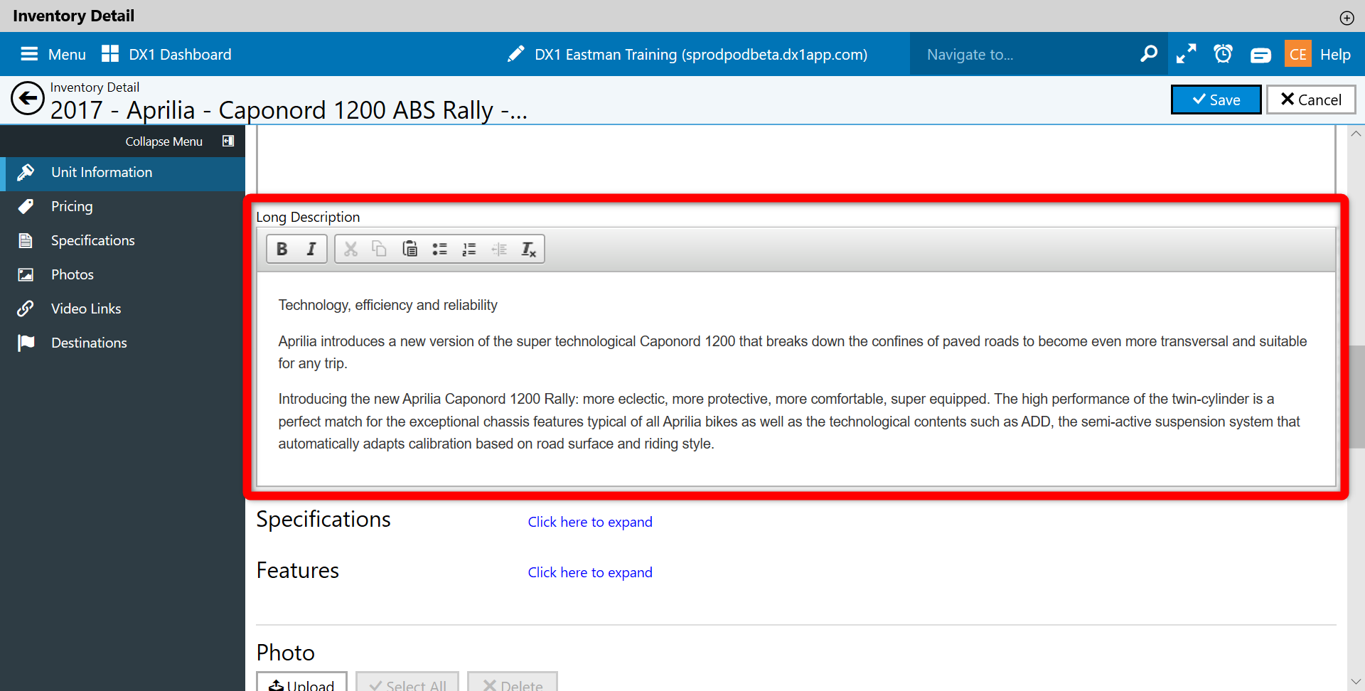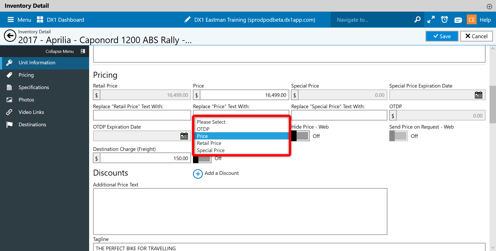 DX1 will default to Unit Information. On the right hand side is the Active toggle switch. This toggle is only turned on when the user wants the unit to appear on the dealership website ONLY. Any additional destinations that had been set to show ( example cycletrader ) the unit will no longer appear and will be removed from inventory listing.