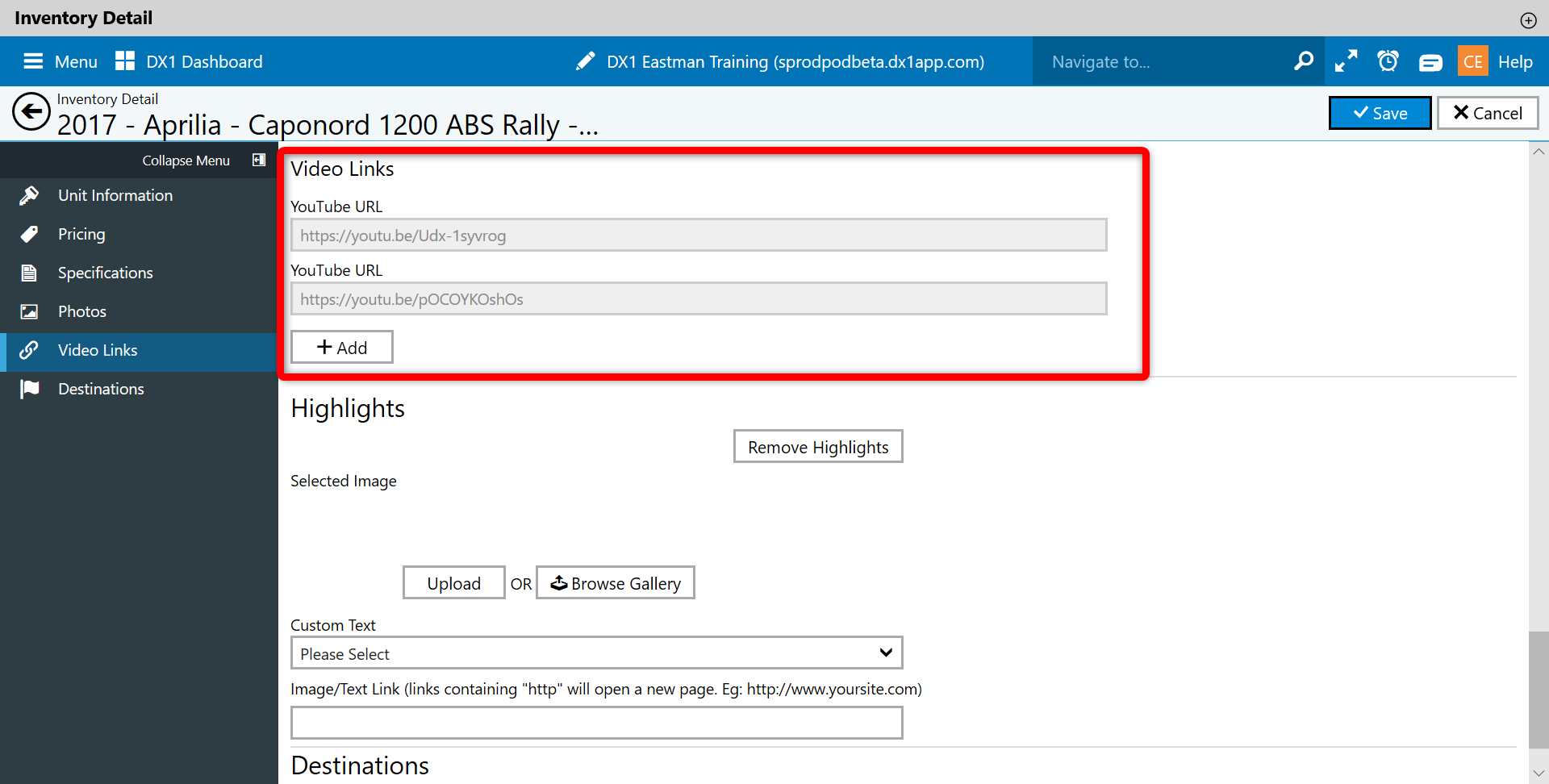 Video Links: Users may add links to any current YouTube video uploaded by the dealership by clicking the Add button.