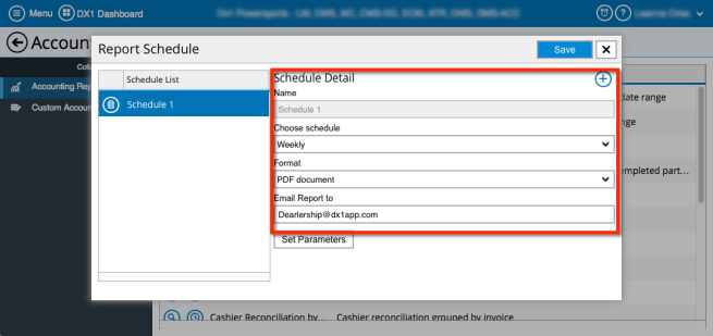 Specific Parameters can be set for the report if applicable