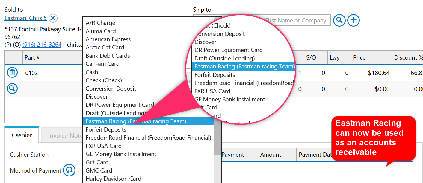 The dealer can now use the new Method of Payment ( in this example Eastman Racing Team)