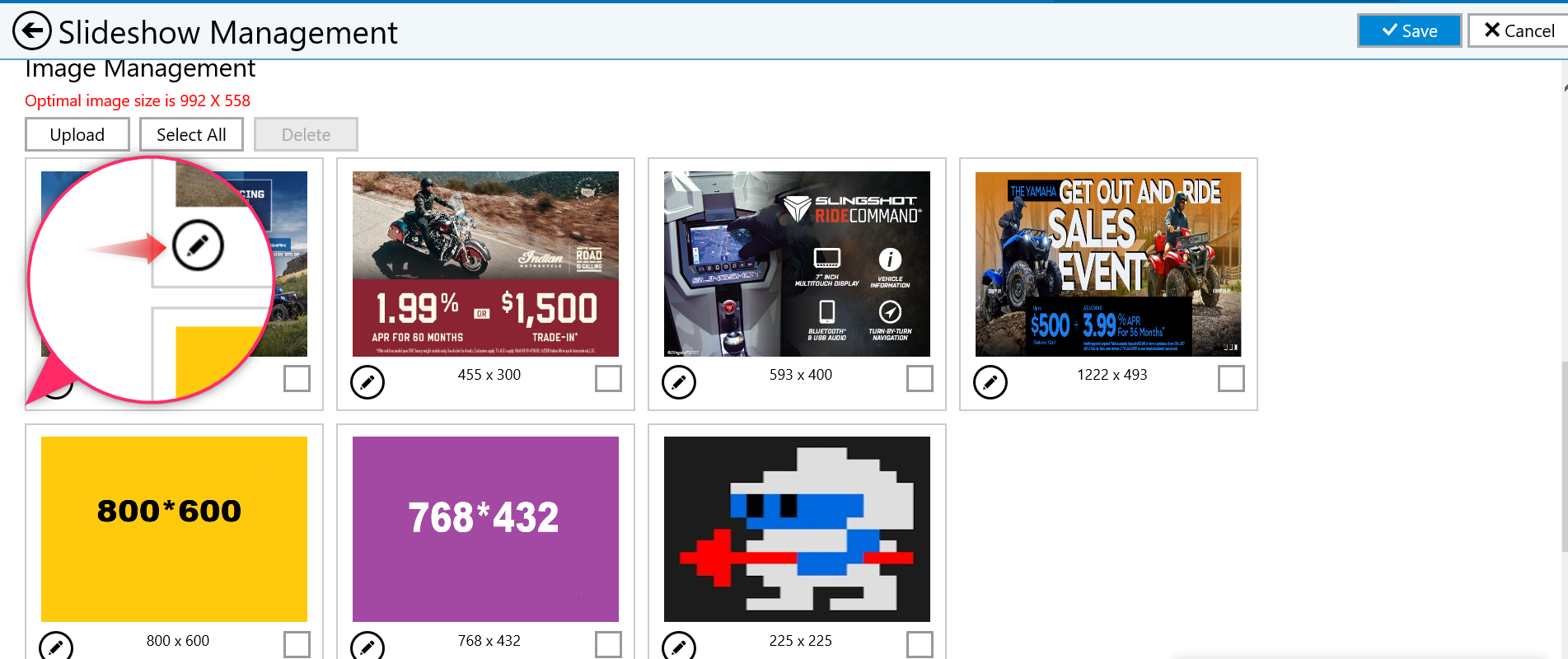 Display in Slideshow: Thumbnail images of all uploaded images display for easy management. Sizes and expiration dates display as well as indication of OEM promotional images with yellow highlighting in the back.