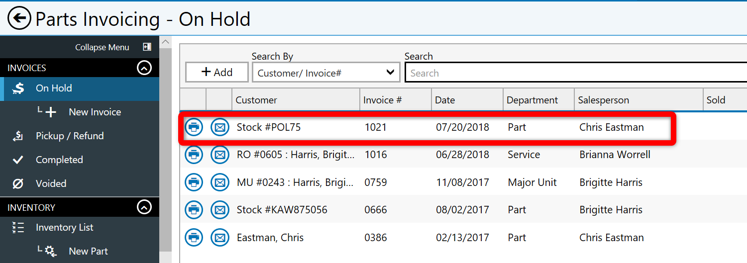 In this example a stock number shows under the on hold area for parts. Since the invoice is on hold this is why the major unit invoice cannot be completed.
