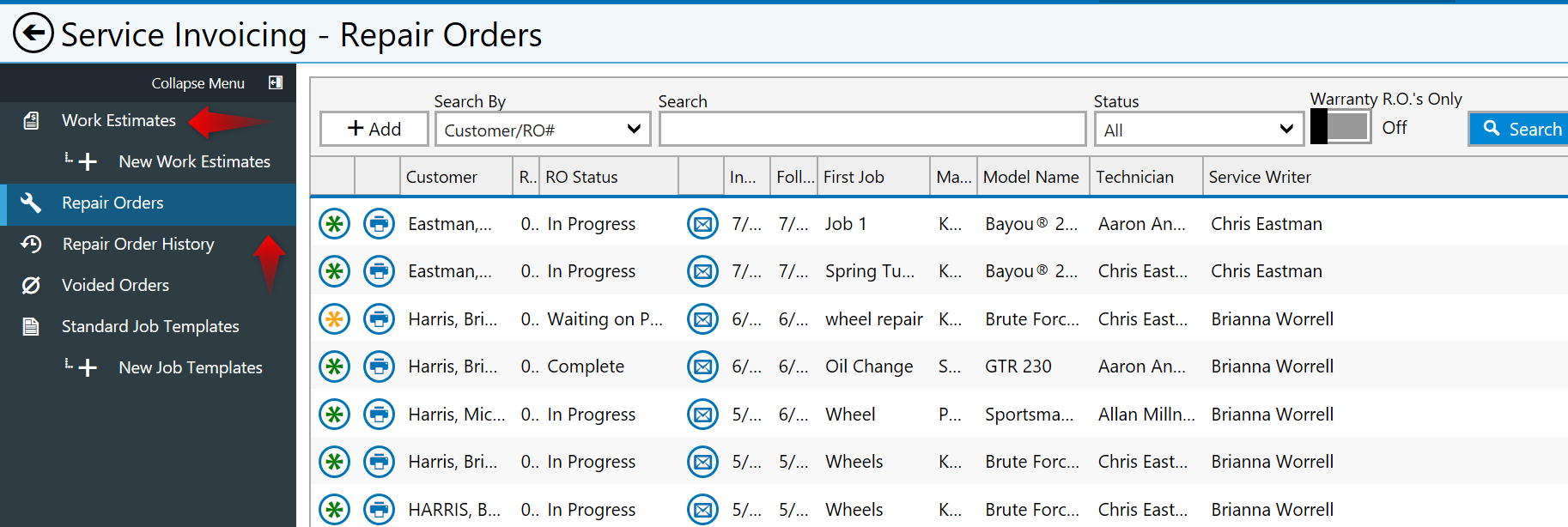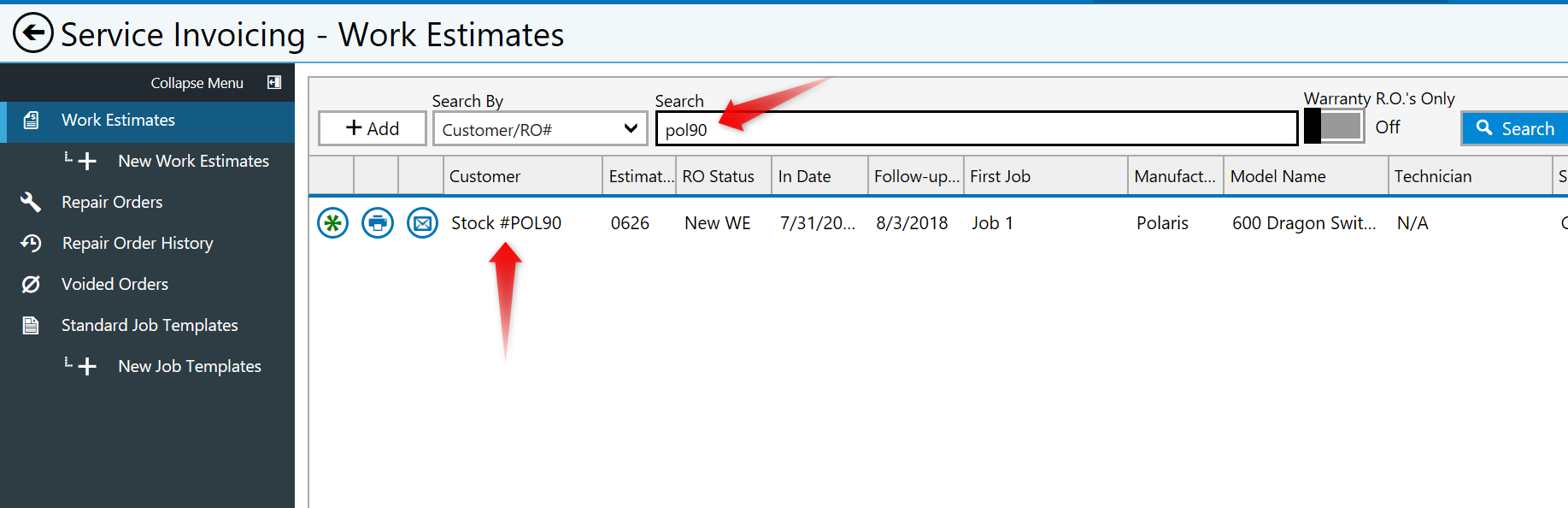 Click on either Work Estimates or Repair Orders to see if an invoice has been opened on the stock number.