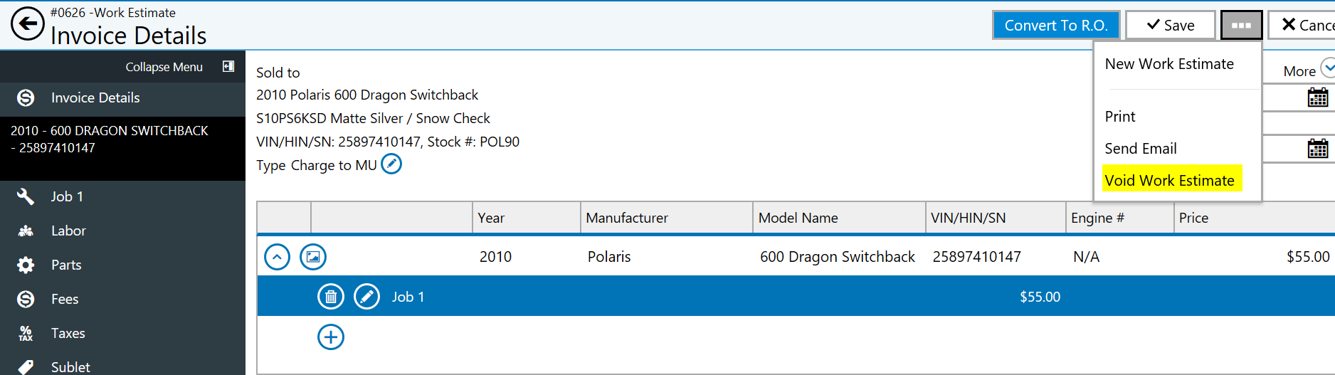 For this example an invoice was attached but parts had yet to be added to the invoice. Click the three dots in the upper right hand corner to void the invoice that was created in error.