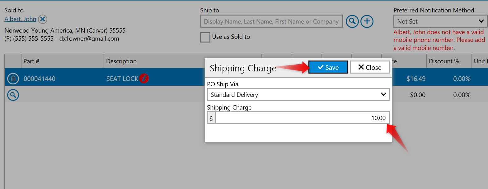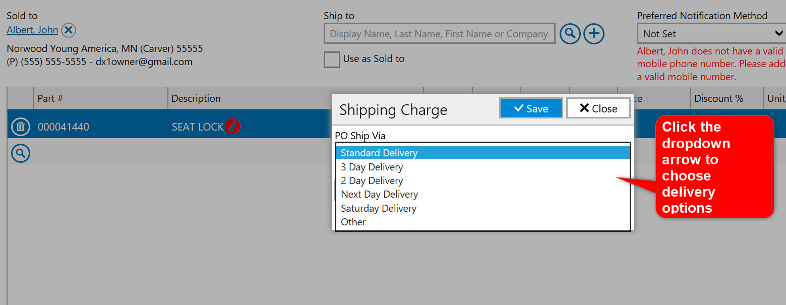 Additionally a Shipping Charge section will be added to the summary section in the lower right hand corner. Users can click on it and make changes before completing the sale. This is done at the individual part line item and is not done at the invoice level.
