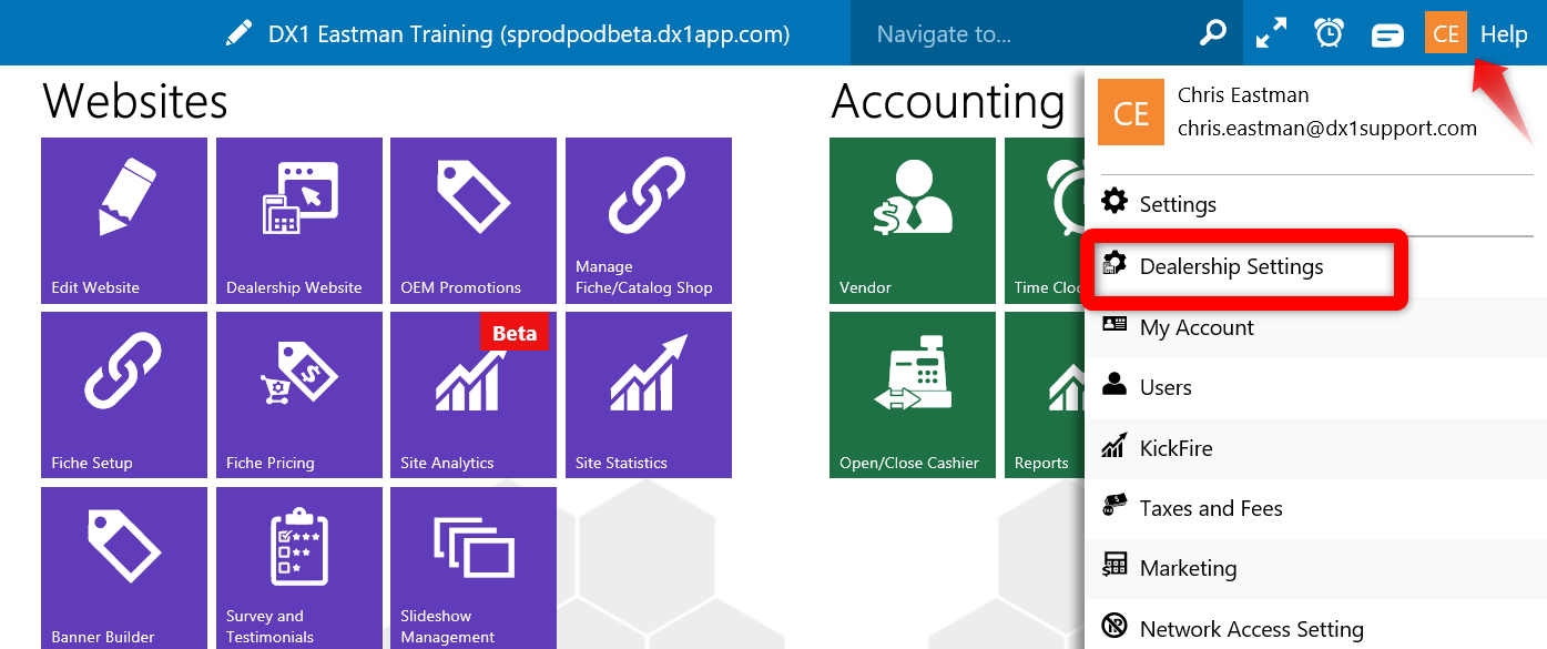 Click on the user name in the upper right hand corner. Then choose Dealership settings.