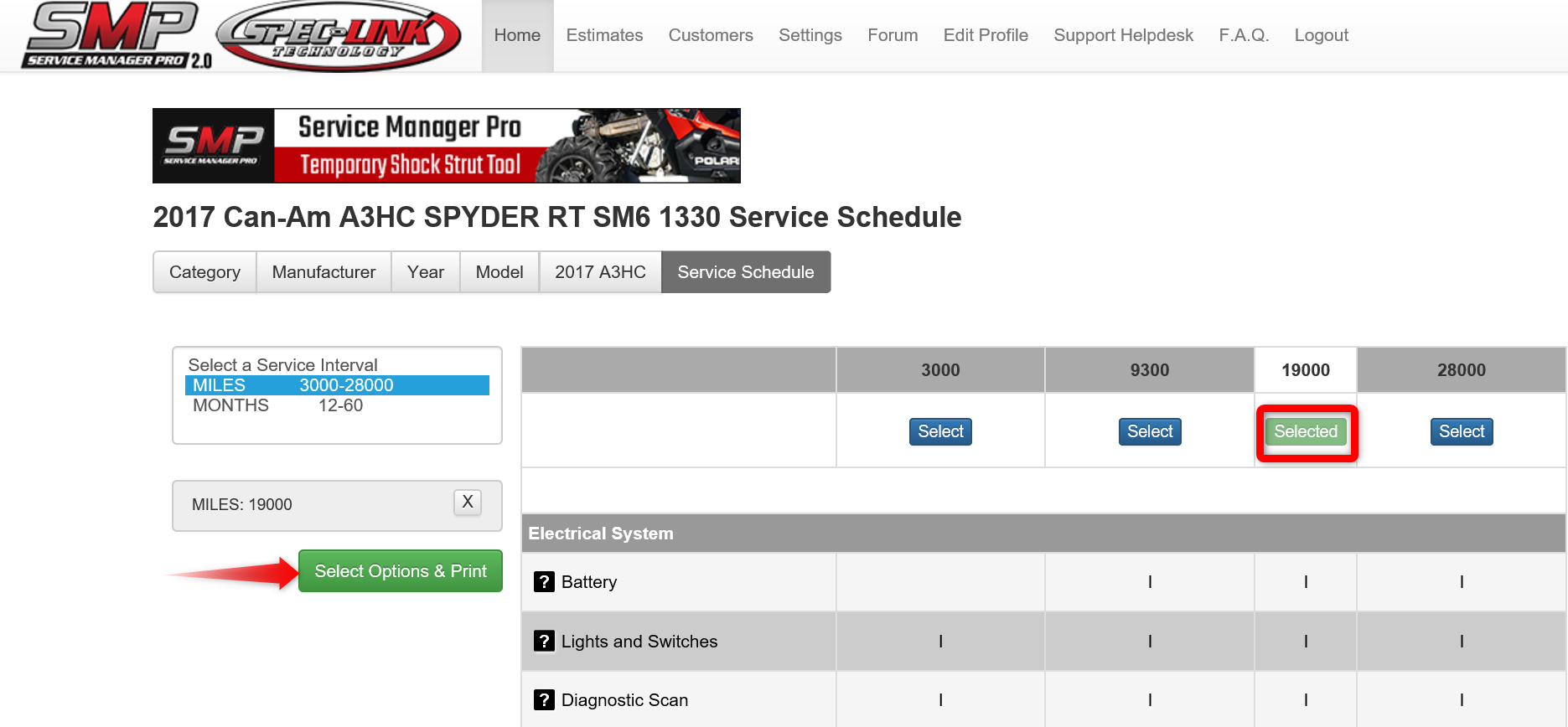 In the example shown for Service Schedule once the Miles or Months option has been chosen, Click Select Options/Print