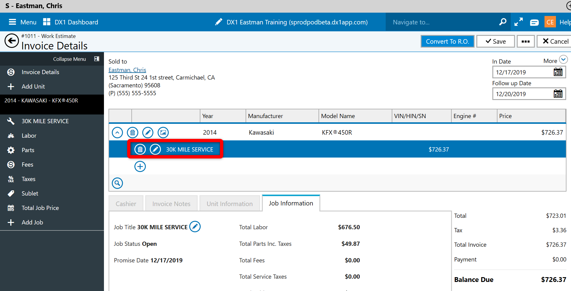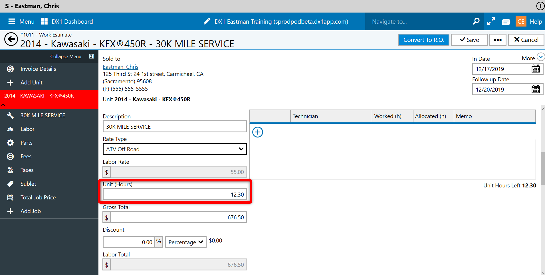 And unit hours will now show on the RO. Note: the technician, labor rate, and any discounts will still need to be manually changed if applicable to the repair order