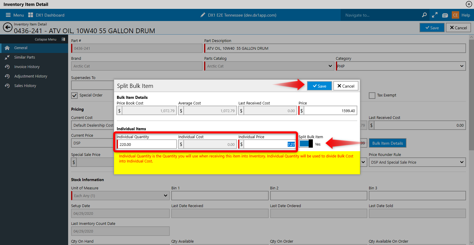 Once set, click the Split Bulk Item toggle to Yes. The Individual Cost and Price will now be reflected based on the split Individual Quantity that was entered. Click Save once done