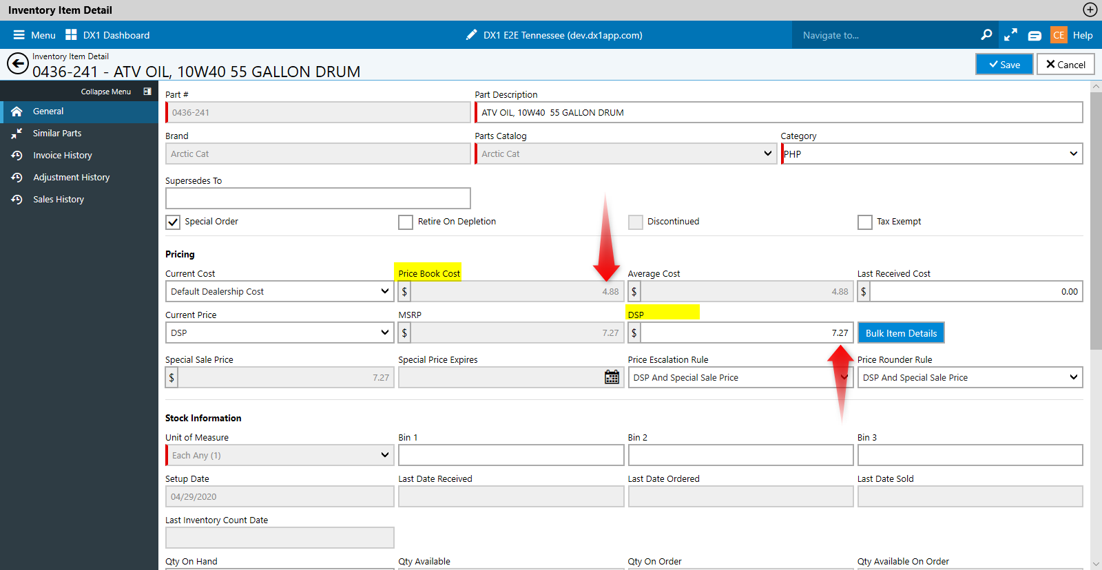 "Note: after a part is set as Bulk the Cost and DSP shown on the Inventory Detail Page will now reflect the Individual item Cost and Price"