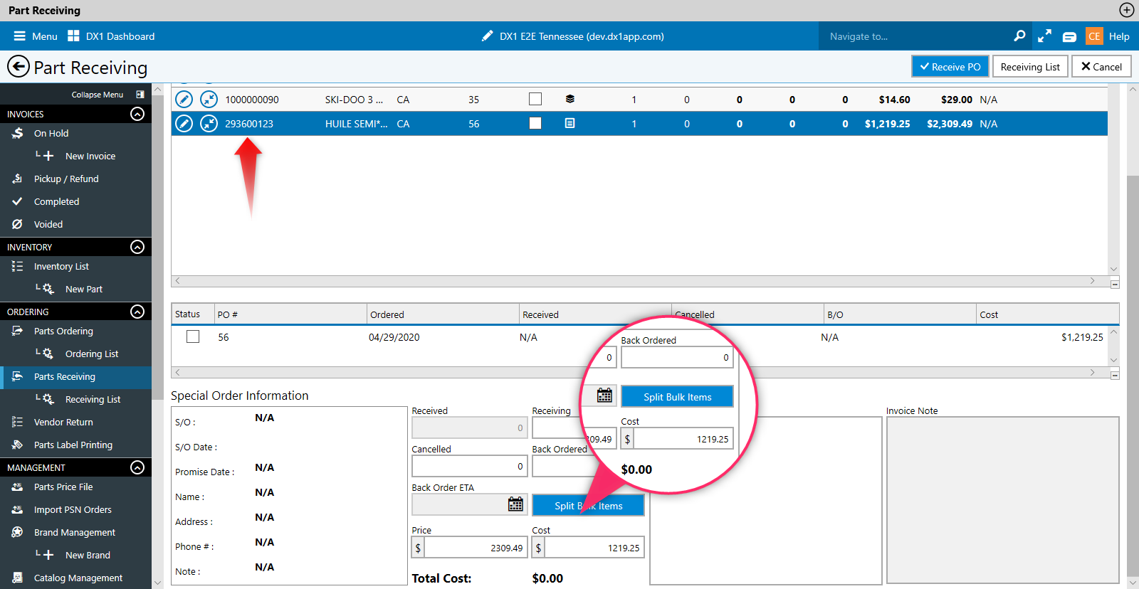 Note: Once the Split Bulk Item feature has been activated on a part number, that part number CANNOT be special ordered moving forward.