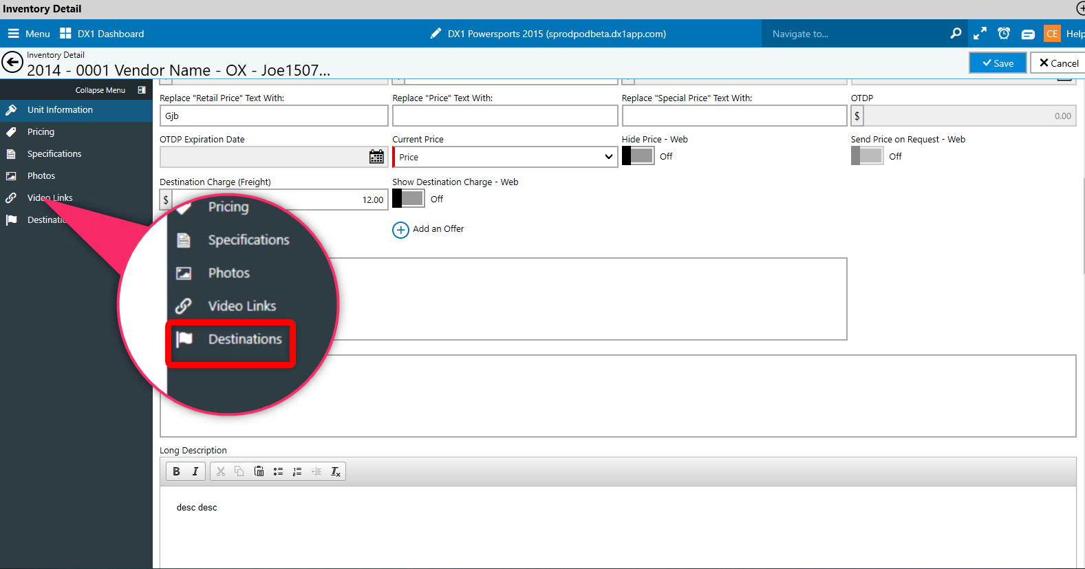 Select the unit from inside Listing Inventory, then click Edit Specs from the menu on the left