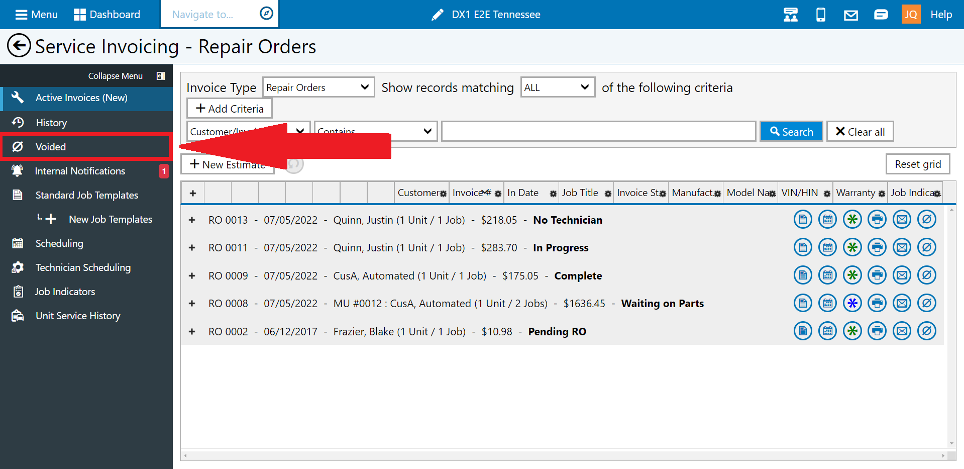 See below for an example of each of the highlighted changes once the voided Repair Order has been restored
