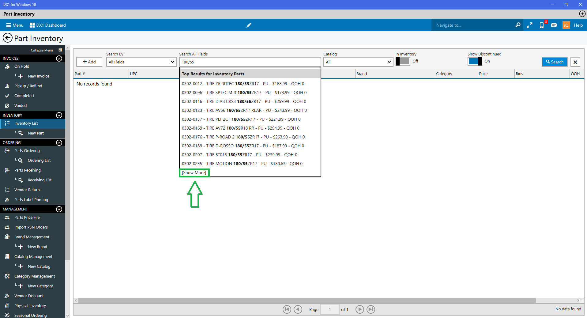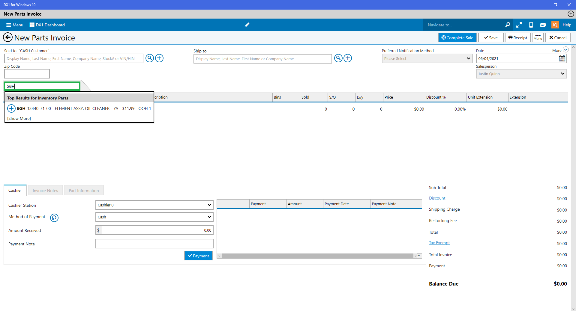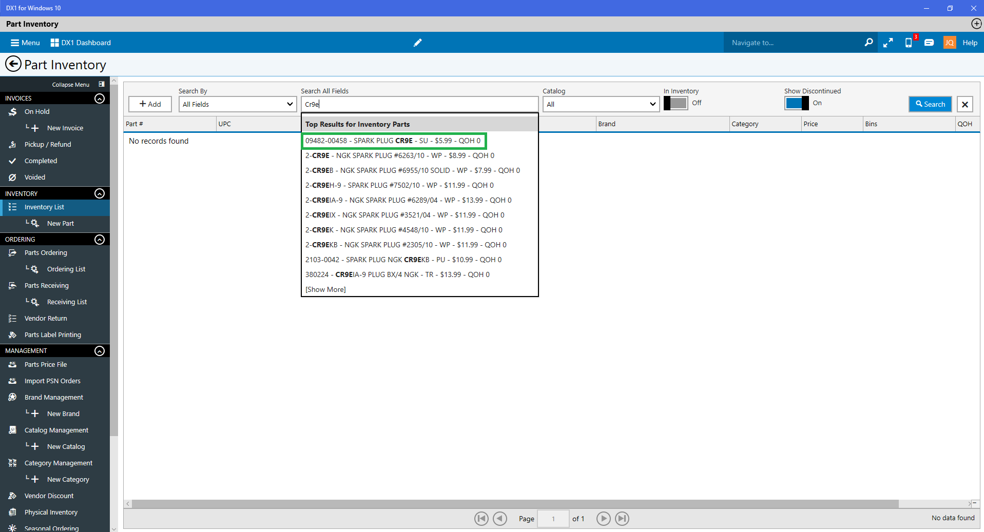 The "AllFields" search function in DX1 allows dealers to quickly access information for parts that have been through the dealership inventory system. The "AllFields" search allows you to search for a part using the part number or description with matching type ahead results.