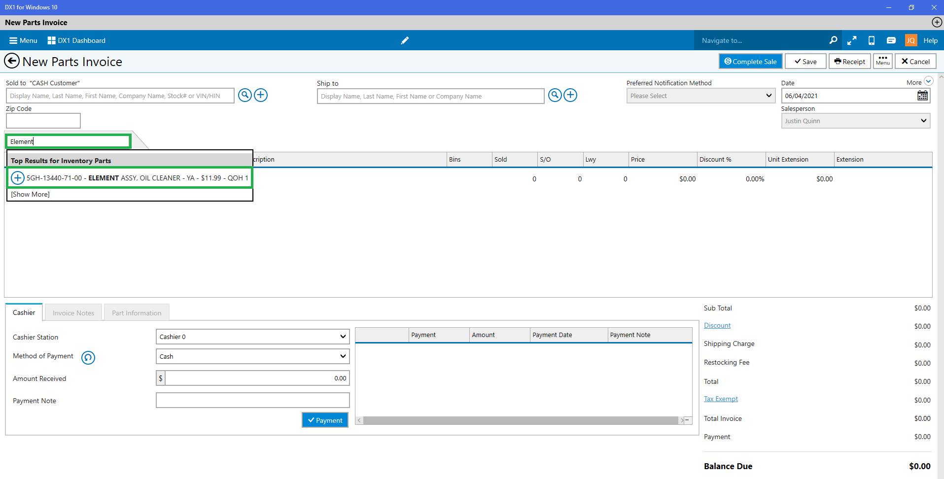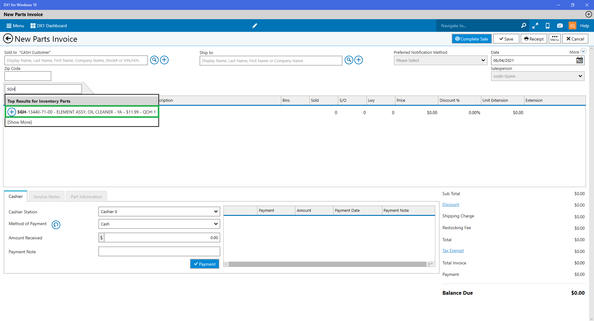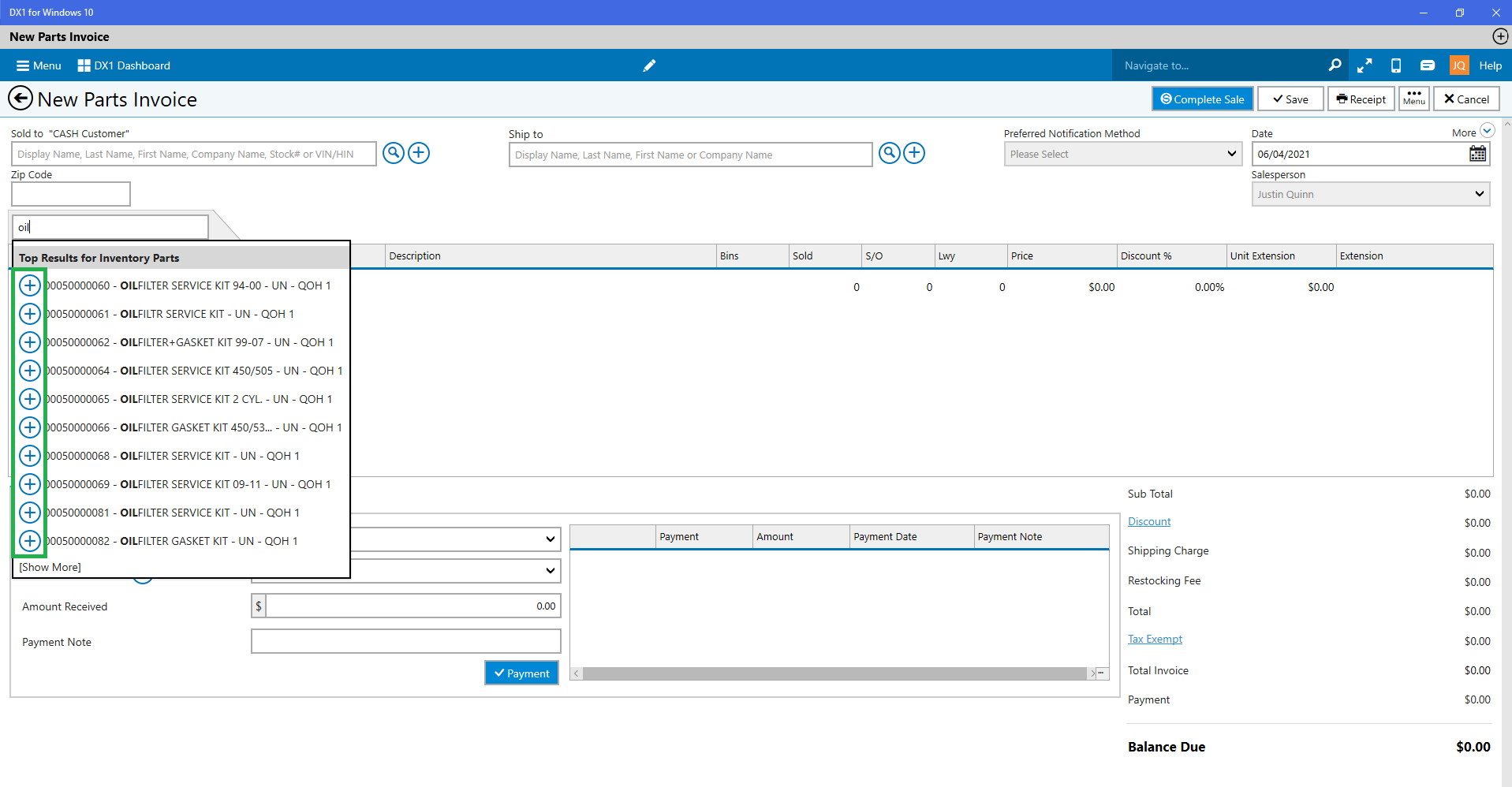 - To add the desired part to an invoice, use the + icon next to the specific part.