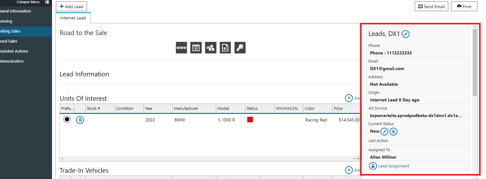 Also the sections below the Unit of Interest for Trade-In, Notes and Scheduled Actions are all collapsible. So you do not have to scroll to find the pertinent information. If there is any information in those areas of the lead, they will by default be open.
