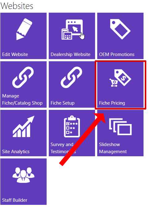 - First, navigate to the Fiche Pricing tile under the Websites tile set.