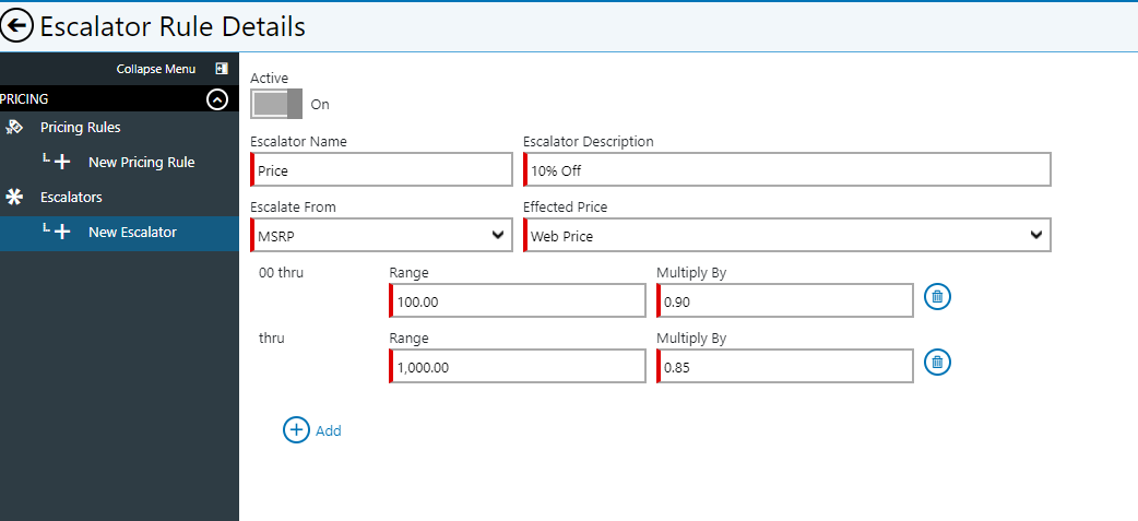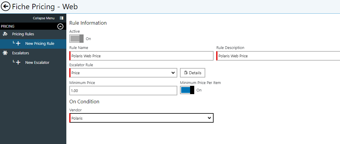 In the example below, the Escalator we created will be applied to Polaris parts. No Polaris parts will ever display a price below $1.00.