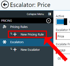 Select Save to save the new escalator. - Next, select New Pricing Rule in the left hand menu.