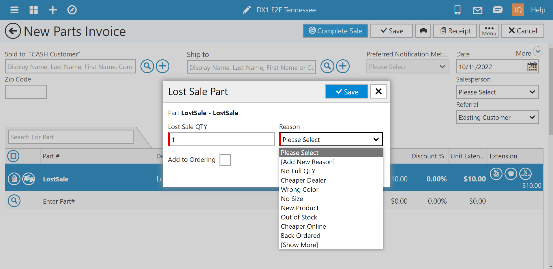 - If permissions allow you can check the Add to Ordering box to simply do that when you click Save to record the Lost Sale.