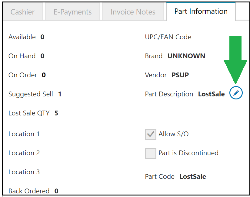 - To determine if or how many of a part line item have been recorded as a lost sale on an invoice, you can click on the Part Information tab and look at the Lost Sale QTY value displayed in bold.
