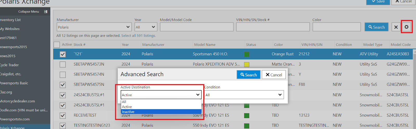 To see any units that are not being sent to Polaris Xchange, use the gear at the top and select Inactive: