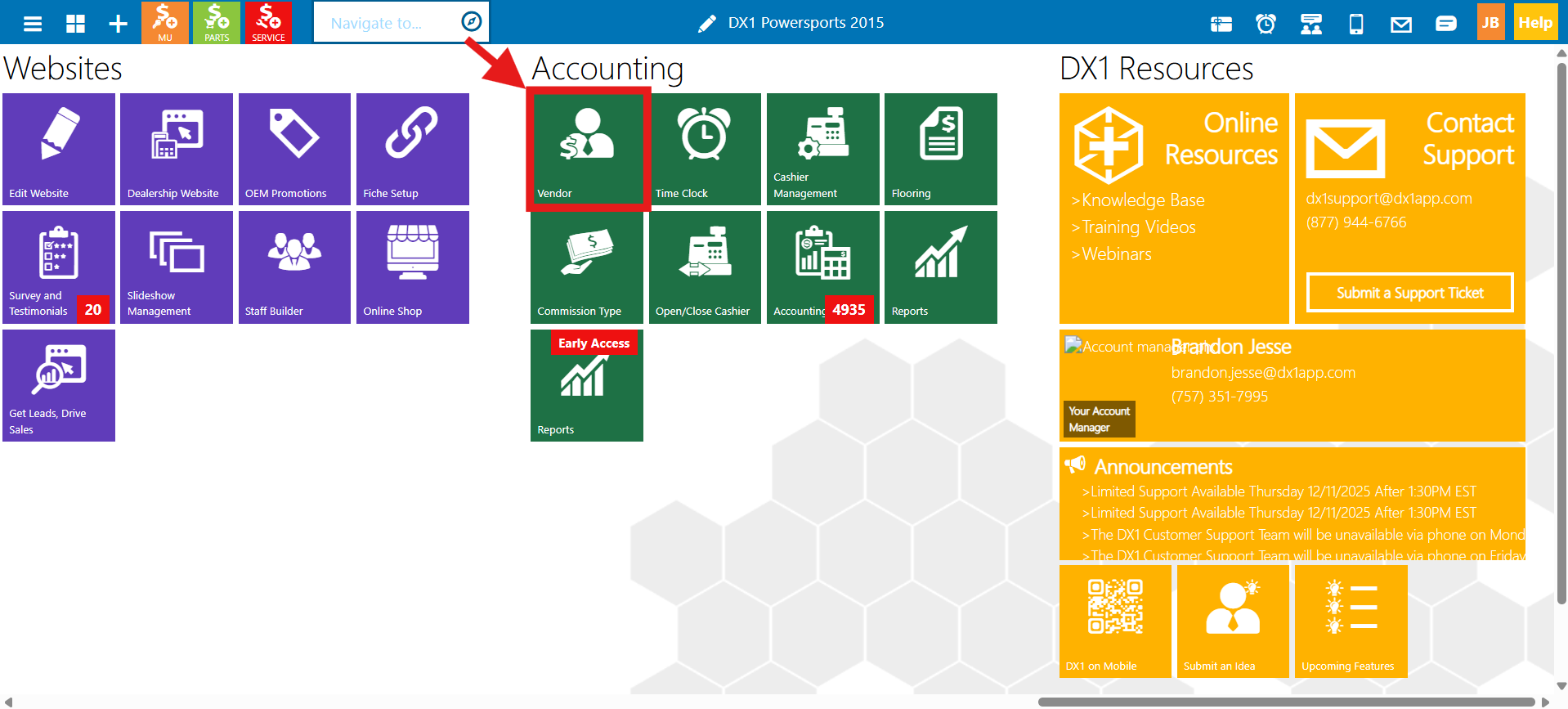 In DX1, click the Vendors tile and open up your "Parts Unlimited" vendor.