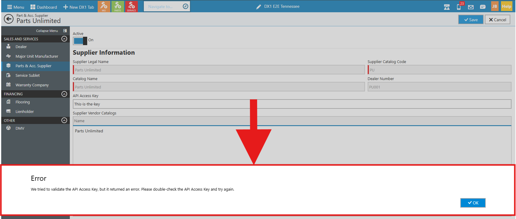 We send a test call to the Parts Unlimited API, with your dealer-specific API Access Key. If you see this error, either your Key is not active, which you will need to contact Parts Unlimited, or your key has a typo.
